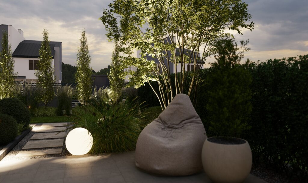 Punktowe podświetlenie roślin, ścian czy elementów małej architektury buduje głębię i