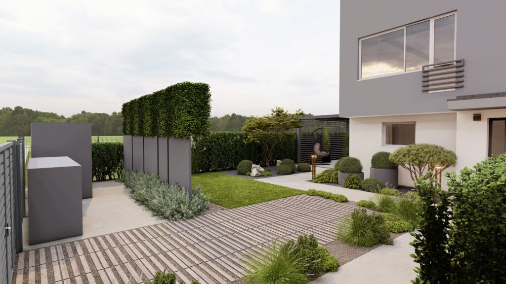 Strefa techniczna: dyskretne ukrycie schowków, kompostowników i pojemników