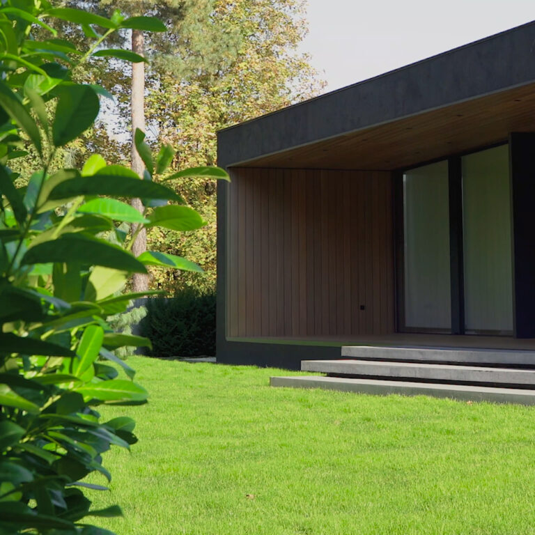 Kulminacją jest aranżacja z tyłu budynku, do której prowadzi nas drewniany podest meandrujący między różnymi rodzajami kamienia. Tam zaprojektowaliśmy nasadzenie z  formowanego iglaka w nawierzchni ze żwirku, celowo “uczesanego” w charakterystyczne dla sztuki japońskiej okręgi.