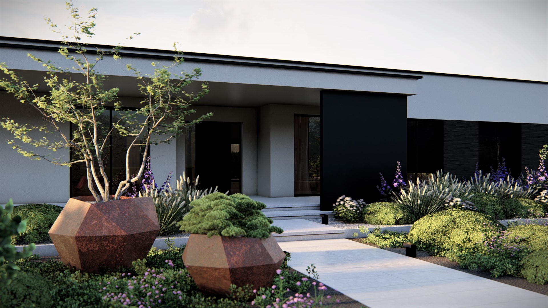 Do nowoczesnego budownictwa pasuje równie nowoczesny ogród oparty na geometrii. Szerokie przestronne przejście, dzięki zastosowaniu wielu pięter roślinnych na każdym kroku zaskakuje nas nowymi elementami. Dzięki zawartym w projekcie donicą dodajemy wejściu do domu jeszcze więcej dynamiki i ekspresji.