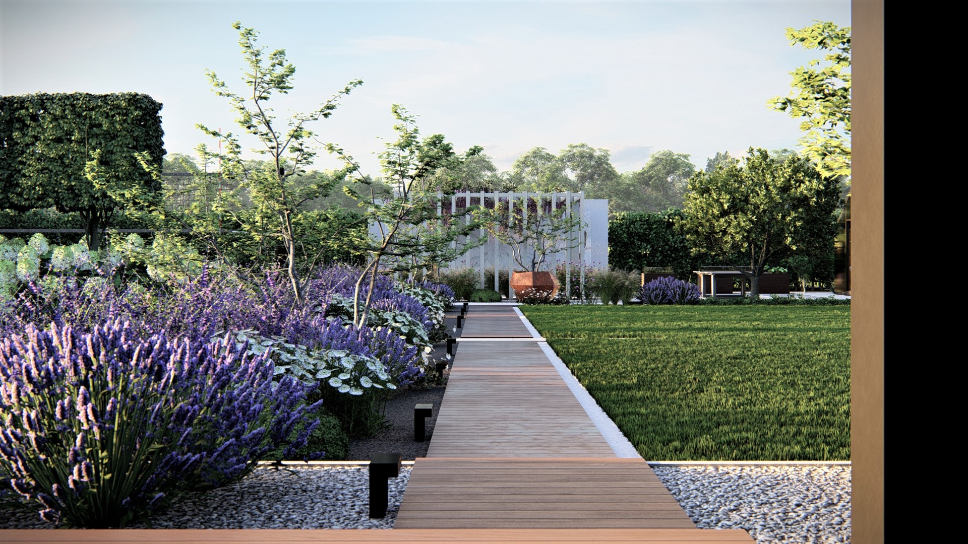 Zastosowanie roślin o kwiatach fioletowych daje nam poczucie spokoju oraz elegancji dodatkowo niewielka ilość gatunków nie wprowadza chaosu w opracowaniu. Prosta ścieżka wskazuje nam pergole obrośniętą Wisterią o fioletowych kwiatach. Podświetlenie komunikacji wieczorem dodaje uroku, oraz wskazuje nam drogę do tego miejsca wypoczynku.